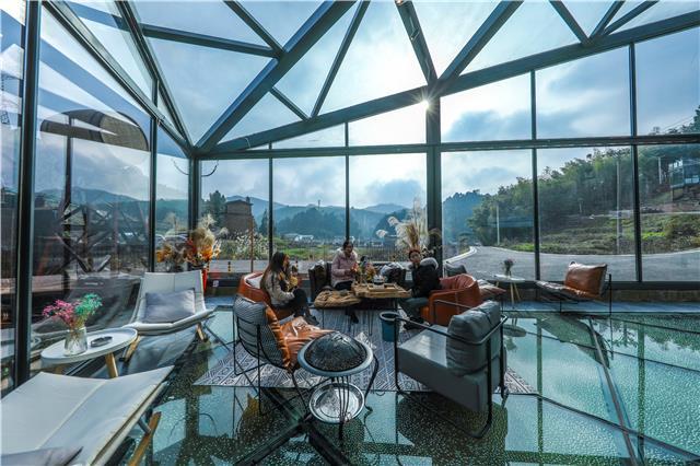 2021年11月23日,竹山镇猎神村,游客在矿咖民宿全景玻璃阳光室休闲玩耍,山中风景一览无余。记者 熊伟 摄