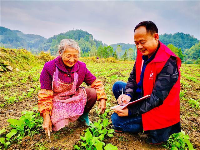 2021年10月28日,七星镇仁安村第一书记陈忠明和村民了解油菜种植情况。鄢纯 摄